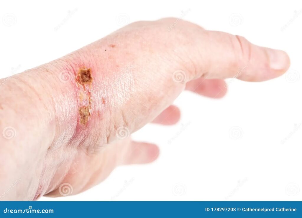 - Huidveranderingen: De huid kan onmiddellijk reageren. Veelvoorkomende tekenen zijn roodheid en de vorming van blaren, vergelijkbaar met thermische brandwonden. Echter, bij chemische brandwonden kan de huid ook zwart of grijs verkleuren, wat wijst op ernstige weefselbeschadiging en afsterving. Een perkamentachtig uiterlijk, beige of bruine tinten kunnen ook voorkomen, vooral bij diepere brandwonden.