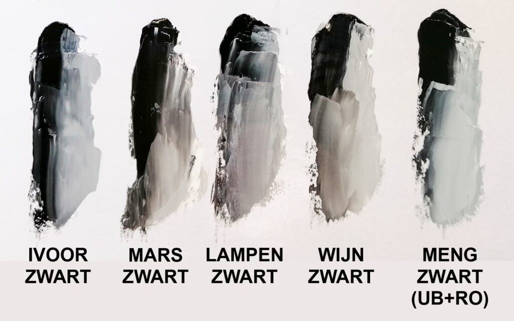 | Lampenzwart (PBk6) | Roet van verbrande olie/vet | Dekkend | Diep, neutraal tot licht koel, blauwachtige ondertoon met wit | Zeer langzaam | Diepe schaduwen, matte afwerkingen, industriële toepassingen |
