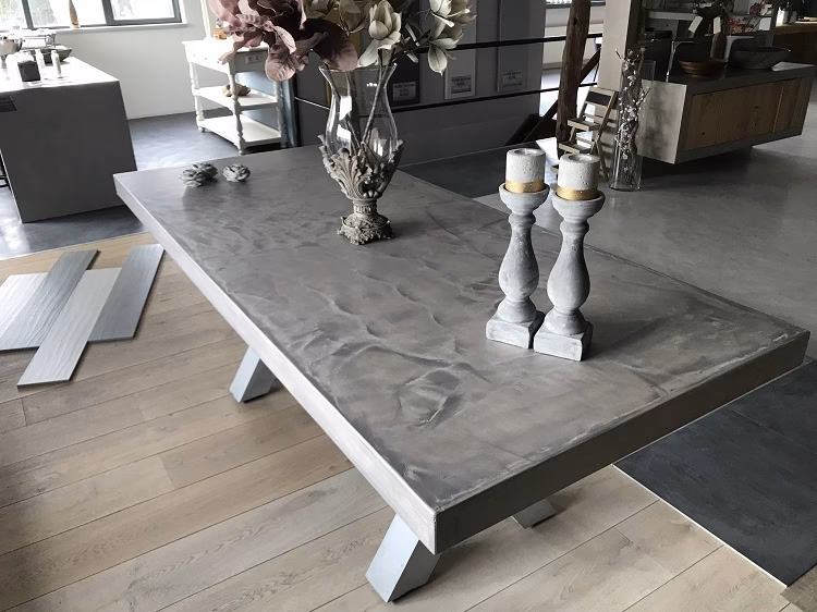 - Flexibiliteit in Design: Door de stuctechniek is betoncire uiterst flexibel in vorm. Of je nu een ronde, ovale, rechthoekige of een organisch gevormde tafel wilt, het stucwerk leent zich perfect voor speciale vormen en maatwerk. Dit opent een wereld aan designmogelijkheden.