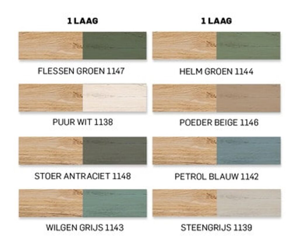 | Uitstraling | Natuurlijke houtkleur en nerf volledig zichtbaar. | Houtnerf zichtbaar, subtiele kleuraanpassing. | Volledige dekkende kleur, houtnerf niet zichtbaar. |