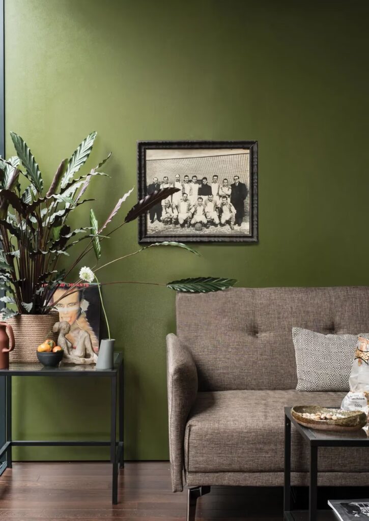 Stel je voor: een eendengroene muur, aangevuld met een bank in petrolblauw en accenten van mosgroene kussens. Dit creëert een serene en evenwichtige ruimte die uitnodigt tot ontspanning. Het is een veilige, maar uiterst effectieve manier om diepte en interesse toe te voegen zonder te contrasteren.