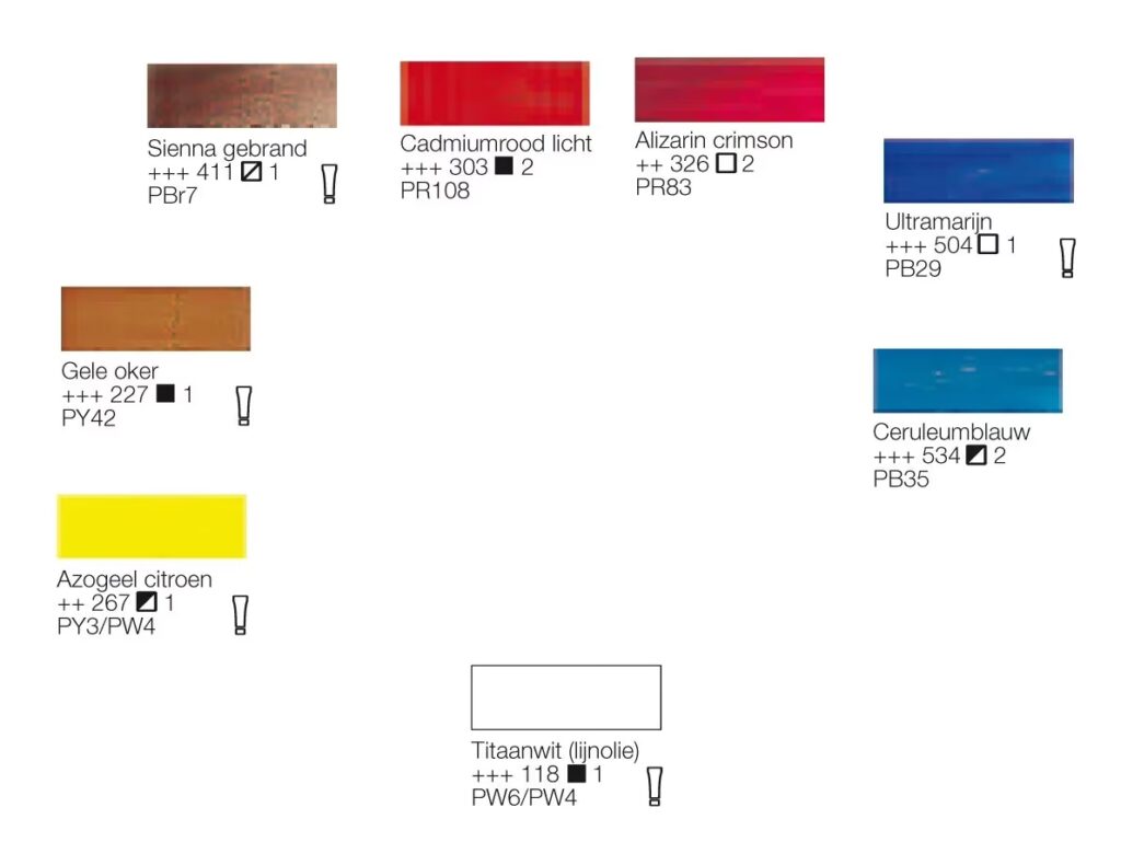 | Maroon | Warme rood (bijv. Cadmium Rood) | Kleine hoeveelheid bruin (gebrande omber) en/of een vleugje zwart | Rijkere, aardse donkerrood. Zwart zeer spaarzaam gebruiken. |