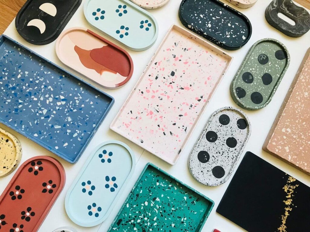Wil je een speels en dynamisch effect toevoegen? Maak dan je eigen terrazzo chips. Dit zijn kleine, gekleurde brokjes Jesmonite die je in je nieuwe gietingen verwerkt. Je maakt ze door een dun laagje gekleurde vloeibare Jesmonite op een schoon en glad oppervlak uit te smeren. Laat het laagje uitharden tot het hard is (dit duurt niet lang). Vervolgens kun je dit harde laagje versnipperen in kleine, onregelmatige brokjes. Deze terrazzo chips meng je vervolgens met de vers aangemaakte vloeibare Jesmonite substantie (die een andere kleur kan hebben voor extra contrast) voordat je gaat gieten. Dit resulteert in een prachtig gespikkeld effect dat doet denken aan traditioneel terrazzo.