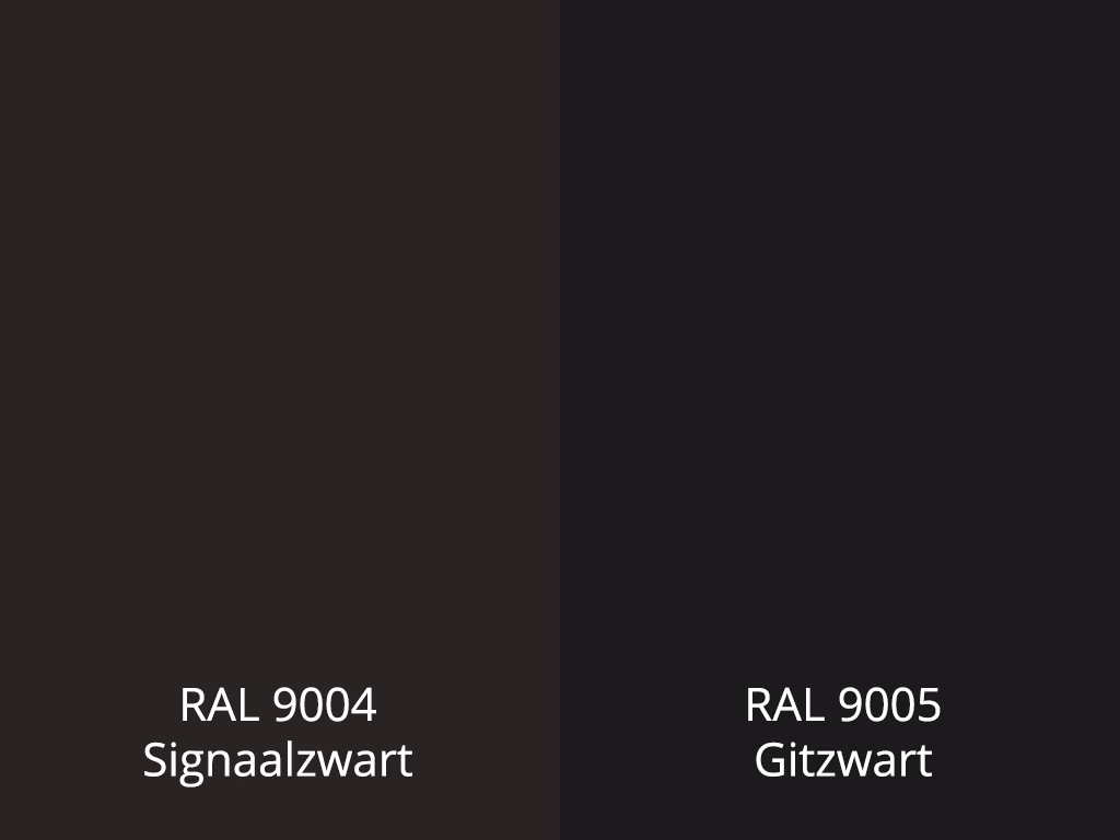 Tussen de zachtheid van Signaalzwart en de diepte van Gitzwart bevindt zich RAL 9017 Verkeerszwart. Zoals de naam al doet vermoeden, wordt deze kleur veel gebruikt in verkeerstoepassingen, wat duidt op een heldere, duidelijke zwarttint die goed zichtbaar is. Het verschil tussen RAL 9017 en RAL 9005 is dat RAL 9017 wat lichter is dan RAL 9005. Waar 9005 het diepste zwart is, biedt 9017 een iets minder intense, maar nog steeds zeer krachtige zwarte kleur.