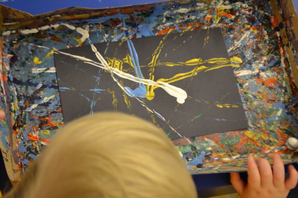 - Klaar: Zodra je tevreden bent met het resultaat, haal je de knikkers voorzichtig uit de doos (bijvoorbeeld met een lepel) en til je het geverfde papier eruit.