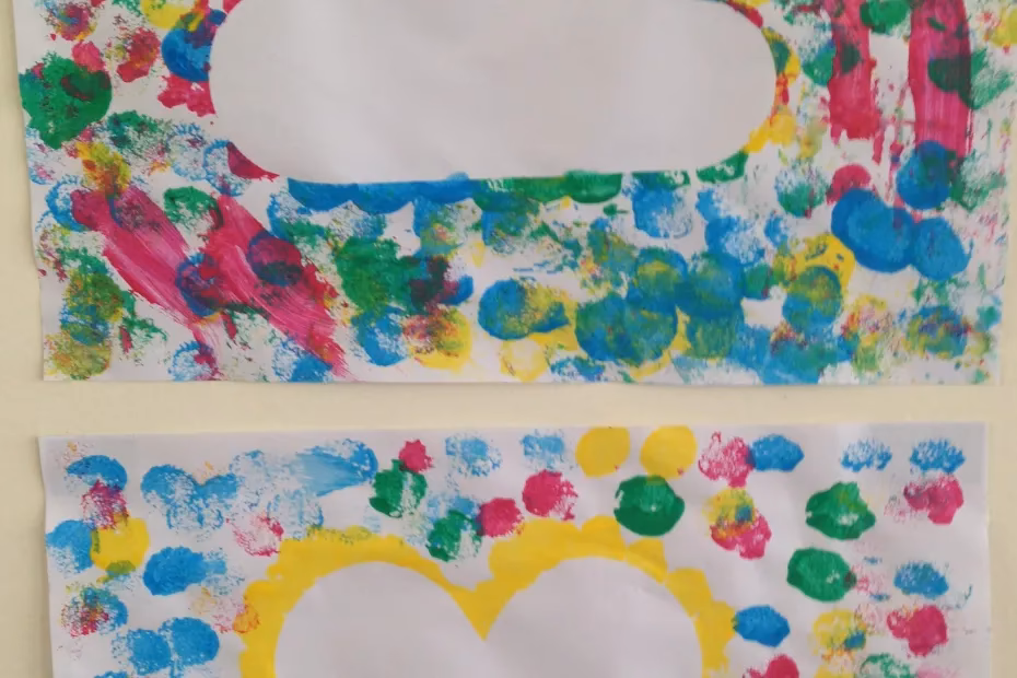 - Plakschilderijen: Breng verf aan op een ondergrond en laat je kind er daarna materialen zoals zand, glitters, of kleine stukjes papier op plakken.