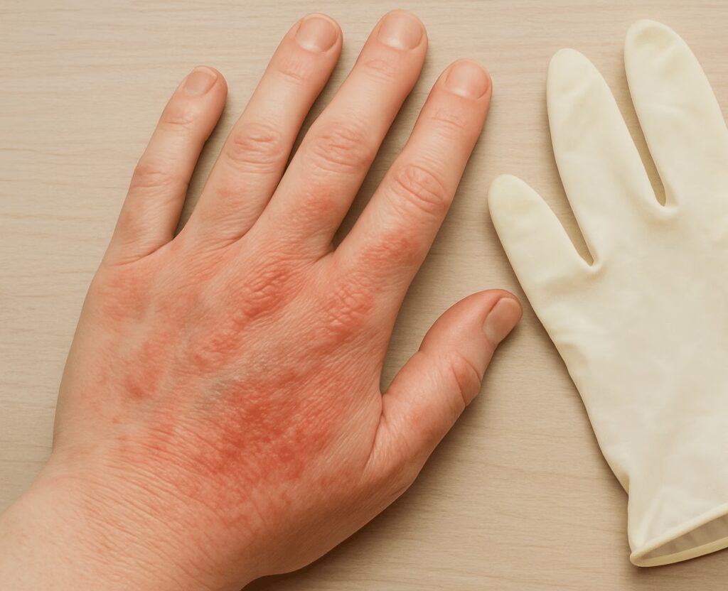 Veel tandheelkundige professionals komen dagelijks in contact met natuurrubberlatexproducten (bijv. onderzoekshandschoenen, cofferdammen, slangen, lokale verdovingscartridges). Residuele eiwitten van natuurrubberlatex (NRL) kunnen tandheelkundige professionals die NRL-handschoenen dragen, sensibiliseren, wat resulteert in een Type I NRL-eiwitallergie. Dit kan een ernstige reactie zijn waarbij de huid (jeuk, zwelling, contacturticaria), het ademhalingssysteem (niezen) en de ogen (conjunctivitis) betrokken zijn. Deze herhaalde blootstelling kan het risico op het ontwikkelen van een latexallergie vergroten. Handlotions op oliebasis kunnen handschoenen aantasten en latexproteïnen oplosbaar maken, waardoor het risico op een allergische huidreactie, zoals jeuk, roodheid of uitslag, toeneemt.