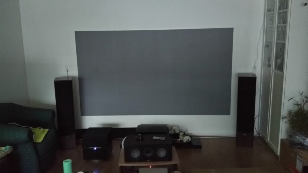 • Gebruik een 'grijsscherm' als alternatief: Zoals eerder besproken, als een volledig projectiescherm buiten budget is, overweeg dan om een stuk van de muur te schilderen met een speciale grijze projectorverf. Dit zal het contrast verbeteren en de invloed van de beige ondergrond verminderen.