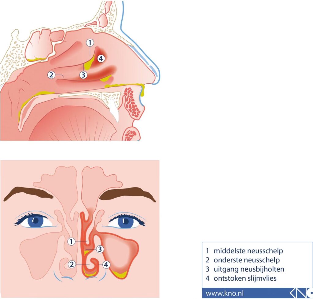 - Druk of pijn in het gezicht: Vooral rond de neus, ogen en het voorhoofd. Dit kan wijzen op betrokkenheid van de neusbijholtes (sinusitis) als gevolg van de zwelling.