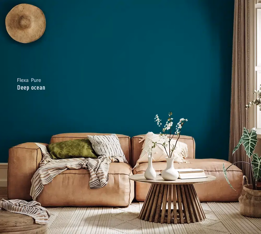 De woonkamer is vaak het hart van het huis, een plek waar we ontspannen, gasten ontvangen en samenkomen. RAL 5020 is perfect voor het creëren van een accentmuur die direct de aandacht trekt en een stijlvolle sfeer neerzet. De diepe, rijke tint voegt karakter toe zonder overweldigend te zijn. Combineer deze accentmuur met neutrale tinten op de overige muren, zoals zachte wittinten (bijv. RAL 9010 Zuiverwit), crèmekleuren (bijv. RAL 9001 Crèmewit) of zelfs een lichte grijstint (bijv. RAL 7035 Lichtgrijs). Dit contrast zorgt voor een dynamisch, maar evenwichtig palet. Om de natuurlijke en rustgevende sfeer te versterken, kun je meubels en accessoires van natuurlijke materialen toevoegen, zoals een robuuste houten salontafel, linnen gordijnen of sisal vloerkleden. Denk ook aan groene planten die de groene ondertoon van het oceaanblauw prachtig complimenteren.