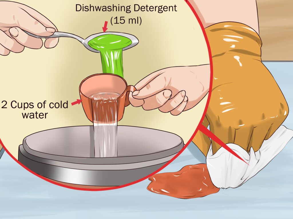 3. Breng afwasmiddel aan: Voeg een paar druppels mild afwasmiddel toe aan de verzachte vlek. Dep het gebied vervolgens zachtjes met een schone, witte doek. Werk van de buitenranden van de vlek naar het midden toe om verspreiding te voorkomen. Blijf deppen en draai de doek regelmatig om een schoon deel te gebruiken.