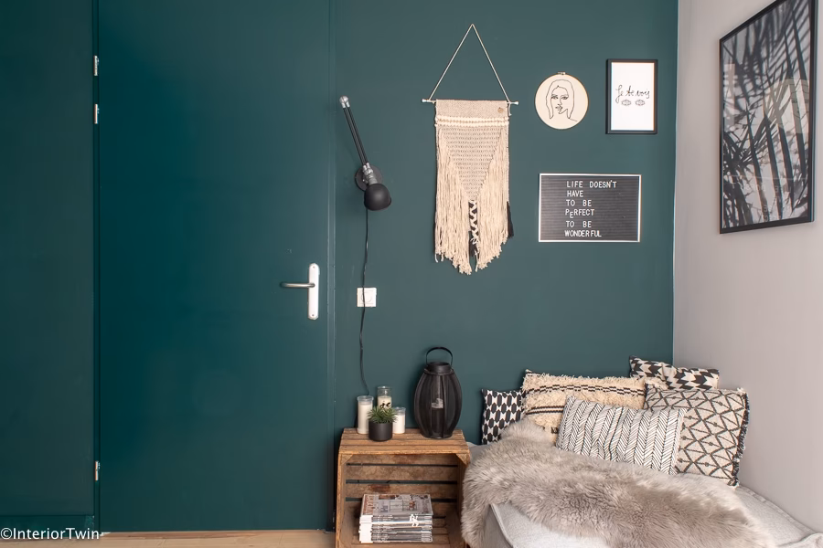• Woonkamer: Creëer een gezellige en elegante sfeer door de accentmuur achter de bank te schilderen. Combineer met crème banken en houten meubels voor een tijdloze look.