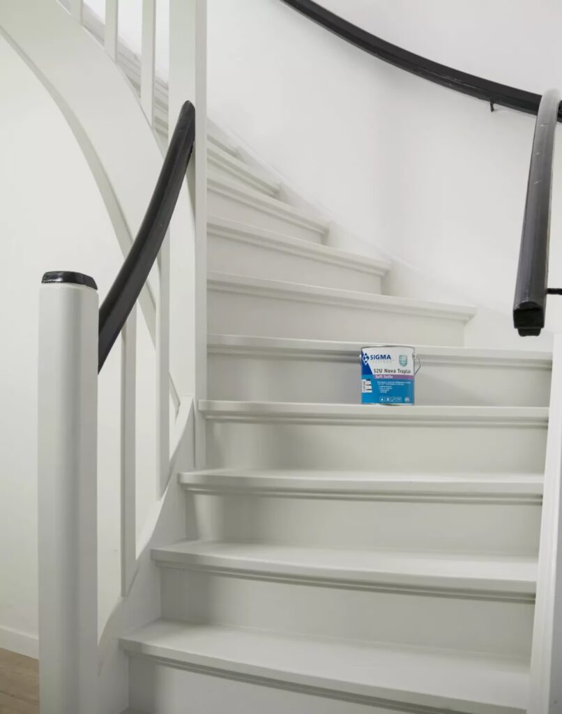 Tip: Als je ook een houten armleuning wilt schilderen, gebruik dan een andere verf. De anti-slip werking van de traplak kan de leuning stroef laten aanvoelen, wat als onprettig kan worden ervaren. Een product zoals de Sigma S2U Nova Satin (zonder anti-slip) is hiervoor een uitstekend alternatief, passend bij de kwaliteit en uitstraling van de traplak.