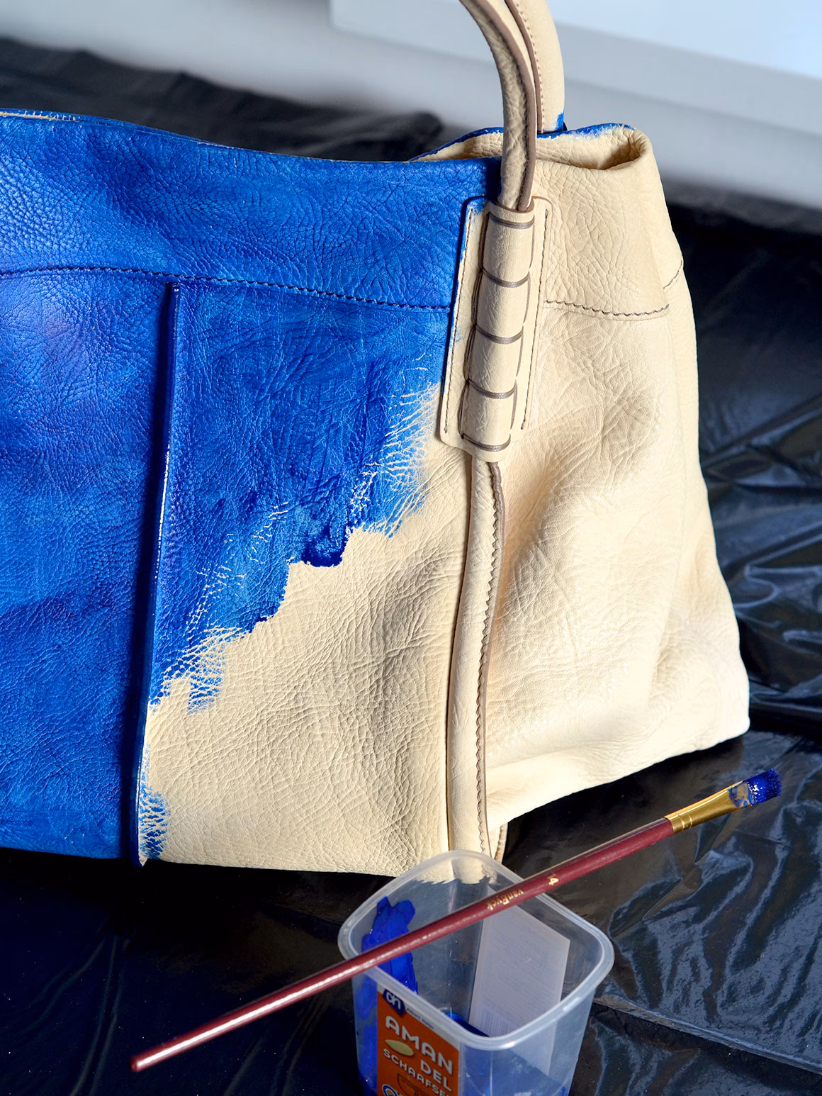 - Verf Aanbrengen: Giet een beetje Angelus Leather Paint in je afsluitbare potje. Doop je penseel erin en begin met het aanbrengen van de verf. Werk in kleine secties en dunne lagen.