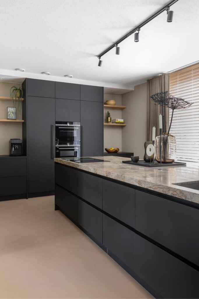 • Zwart Kookeiland: Maak van het kookeiland het centrale punt door deze zwart te maken, terwijl de rest van de kasten lichter zijn. Dit 'aardt' de ruimte en creëert een prachtig focuspunt.