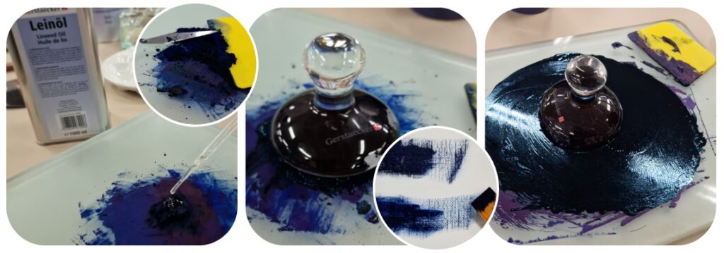 - Meng het pigment en de olie met je paletmes: Begin met het voorzichtig mengen van de olie en het pigment. Gebruik het paletmes om het pigment van de randen van de 'vulkaan' naar het midden te trekken en de olie erin te werken. Dit is het moment waarop de magie begint te gebeuren, en de droge poeder transformeert in een rijke, romige pasta.