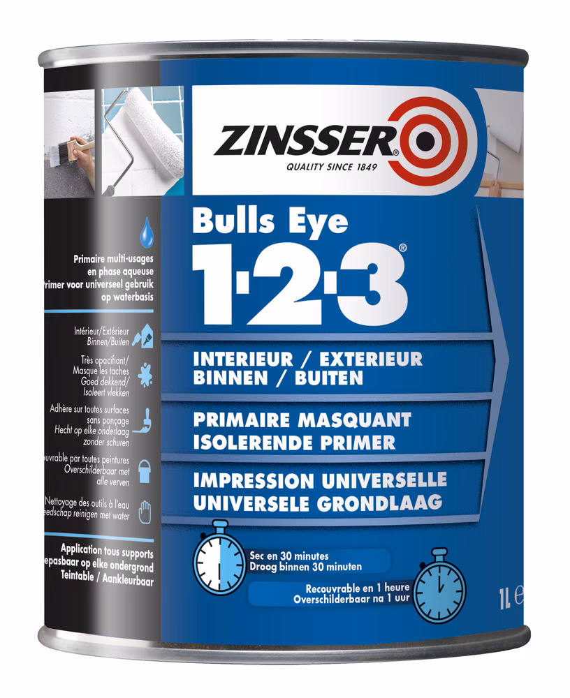 | Zinsser Bulls Eye 1-2-3 | Water (acryl) | Multifunctioneel, uitstekende hechting op veel ondergronden, schimmelbestendig, snel droog, binnen & buiten, lage geur. | Algemene primer voor muren, plafonds, hout, gips, metaal, voor nieuwe en eerder geschilderde oppervlakken. | 1 uur |